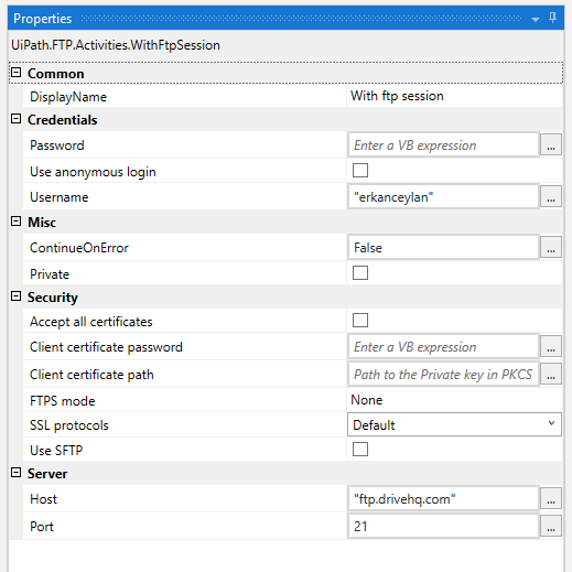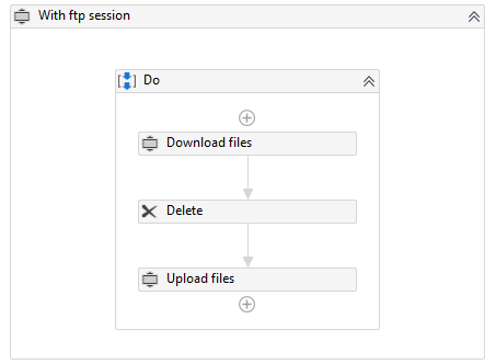 With Ftp Session aktivitesi, FTP bağlantısının kurulduğu bir konteyner aktivitesidir. FTP ile ilgili bütün işlemler bu Sequence tipindeki bu konteynerın içerisinde gerçekleşmektedir. Aktivitenin bittiği yerde FTP bağlantısı da otomatik olarak kapatılır.