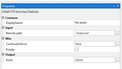 Karşı bilgisayarın sisteminde belirli bir klasörde, aradığımız bir dosyanın var olup olmadığını kontrol eden aktivitedir. Output parametresi olarak bize Boolean tipinde True ya da False olarak bir değer döner.