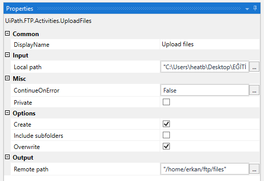 Input parametresi olan Local path alanına karşı sisteme yüklemek istediğimiz dosya ya da klasörün adı girilir. Remote path alanına, yüklenecek olan dosyaların karşı sunucu bilgisayarının dosya sisteminde yer alacağı klasör yolunu yazılır. Yükleyeceğimiz öğelerlerde yer alan klasörlerin karşı sistemde yeni klasör olarak oluşturulmasını istiyorsak, Create alanını işaretli hale getirmeliyiz. Karşı sisteme yükleyeceğimiz klasörü içerisinde yer alan öğelerle birlikte kopyalamak istiyorsak Include subfolders seçeneğini işaretlemeliyiz. Son olarak karşı sisteme upload edeceğimiz dosyayla aynı isimde bir dosya zaten karşı sistemde mevcutsa, yeni yüklediğimiz dosyanın eski dosyanın üzerine yazmasını istiyorsak, Overwrite seçeneğini işaretlemeliyiz.