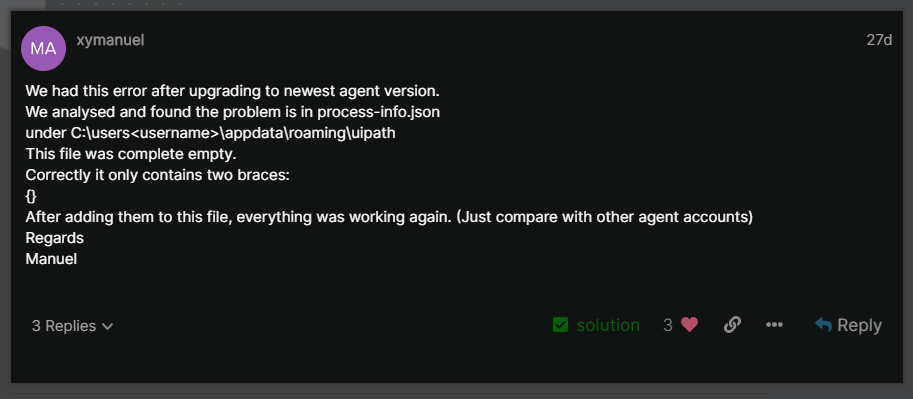 Evet çözüm buydu. UiPath mühendisleri yeni versiyonun kurulumu için geliştirdikleri setup’da bu dosya içerisine iki karakter yazmayı atladığı için UiPath Agent Desktop uygulaması her process çalıştığında bu json’ını okuyamıyor, içerisine veri yazılamıyor ve bu anlamsız bug’a sebebiyet veriyordu.