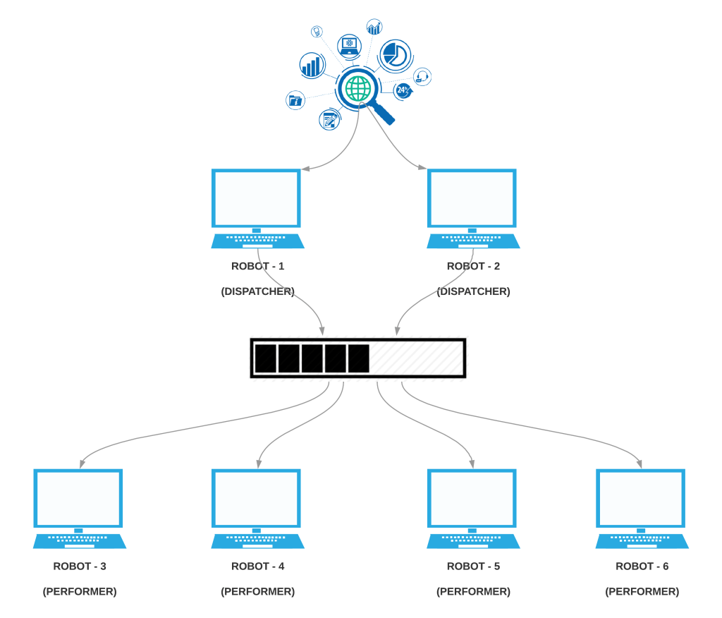 Dispatcher; veri toplayan ve kuyruğa ileten projeyi, Performer ise; verileri kuyruktan okuyan ve işleyen projedir. Yani bir RPA projesini Dispatcher-Performer mantığıyla gerçekleştirmek için ikiye bölmeli ve iki faz şeklinde geliştirmelisiniz. Bu yöntemi kullanarak robotlarınızı eş zamanlı olarak çalıştırabilirsiniz. Aşağıda çizdiğim şema aslında temel bir Dispatcher-Performer yapısını ifade ediyor. Burada aynı anda 2 robotun Dispatcher projeyi çalıştırarak kuyruğu beslediğini ve 4 farklı robotunsa kuyruktaki verileri okuyarak eşzamanlı olarak birbirinden fazlı öğeler üzerinde işlemler yaptığını görmekteyiz.