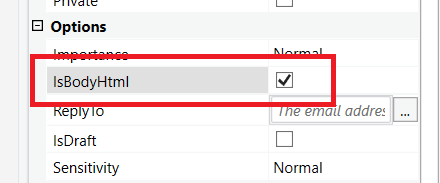 Şimdi gelelim bu işlemi nasıl yapacağımıza. Öncelikle mailin body’sinde bir resim içeriği yer almasını istiyorsak mailin body’sinin HTML formatında olması gerekmektedir. Body’nin HTML olmasını sağlamak için tüm mail gönderme aktivitelerinde bulunan “IsBodyHtml” checkbox’ını işaretlememiz gerekmektedir.