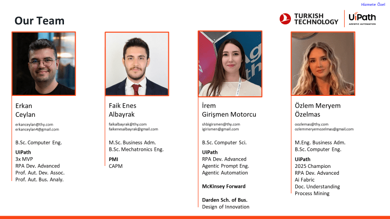 Öncelikle Agentic AI çağındaki ilk hackathon’a katılmak çok güzel bir deneyim oldu. Yarışmaya bizimle beraber 50’den fazla ülkeden 400’den fazla proje katılmış. Bu bile yarışmanın büyüklüğünü aldığımız ödülün kıymetini bize gösteriyor. Projenin detaylarına geçmeden yarışma sürecinde gece-gündüz emek veren tüm ekip arkadaşlarıma tekrar teşekkür ederim, ayrıca UiPath‘e bu güzel organizasyon için tekrar teşekkür ederim.
