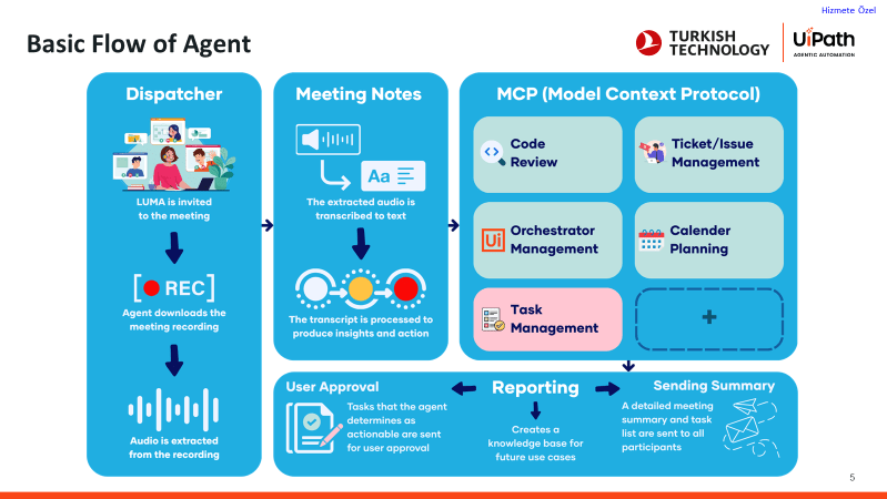 Temel mantığımız şu: Toplantı bittiğinde her şey bitmesin, asıl iş o zaman başlasın. LUMA, farklı yapay zeka modellerini (OpenAI GPT-4o, Google Gemini, DeepSeek) ve UiPath’in güçlü otomasyon yeteneklerini birleştirsin istedik. Alttaki şema aslında LUMA’yı en güzel özetleyen görsel.