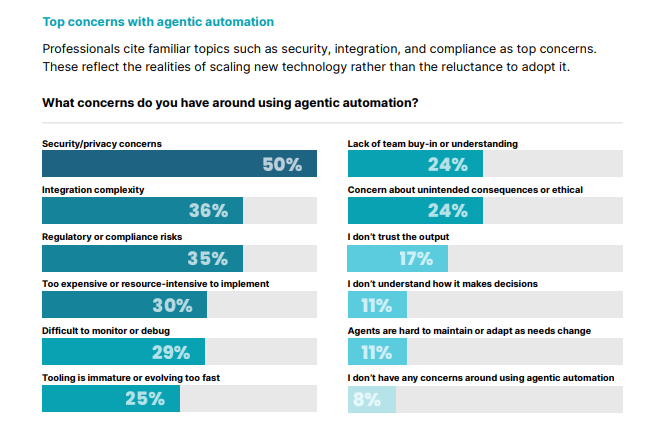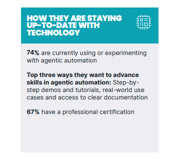 Rapor, otomasyon profesyonellerinin %74’ünün agentic automation kullandığını veya aktif olarak denediğini gösteriyor. Bu oran, agentic yaklaşımın “gelecek vizyonu” olmaktan çıkıp günlük iş yapış biçimlerini dönüştürdüğünü kanıtlıyor.