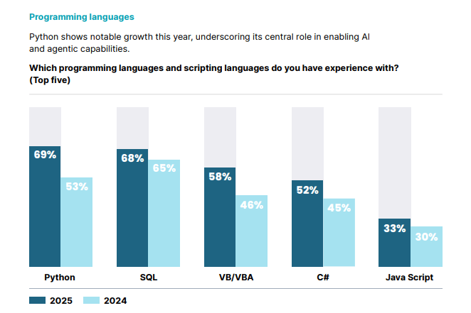 2025’te Python, otomasyon profesyonelleri arasında en hızlı yükselen dil oldu. Rapora göre Python kullanımı geçen yıla göre ciddi artış gösterdi. Agentic automation; LLM’ler, API’ler ve veriyle iç içe çalışıyor. Python dili de bu ekosistemin en önde gelen yazılım dili olarak ön plana çıkıyor.