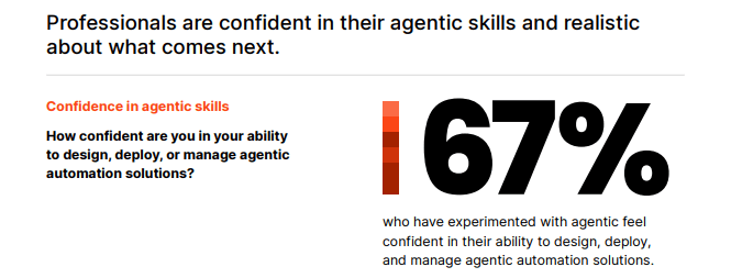 Agentic automation ile çalışanların %67’si, bu çözümleri tasarlama, devreye alma ve yönetme konusunda kendini “confident” hissediyor. AI korkusu yerini AI ile birlikte üretme özgüvenine bırakmış durumda.
